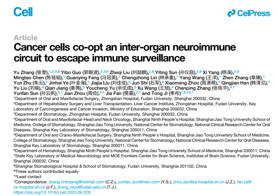 复旦大学附属中山医院季彤教授、樊嘉院士、周俭教授、孙云帆教授及上海交通大学医学院附属第九人民医院张陈平教授为本文通讯作者。复旦大学附属中山医院“卓越住院医师”临床博士后张誉博士、郭毅波博士、复旦大学附属中山医院口腔颌面外科刘喆麒博士、上海交通大学医学院附属第九人民医院孙仪庭博士及杨溪主任医师为本文共同第一作者。中国科学院脑科学与智能技术卓越创新中心蒲慕明院士为本研究提供特别支持。