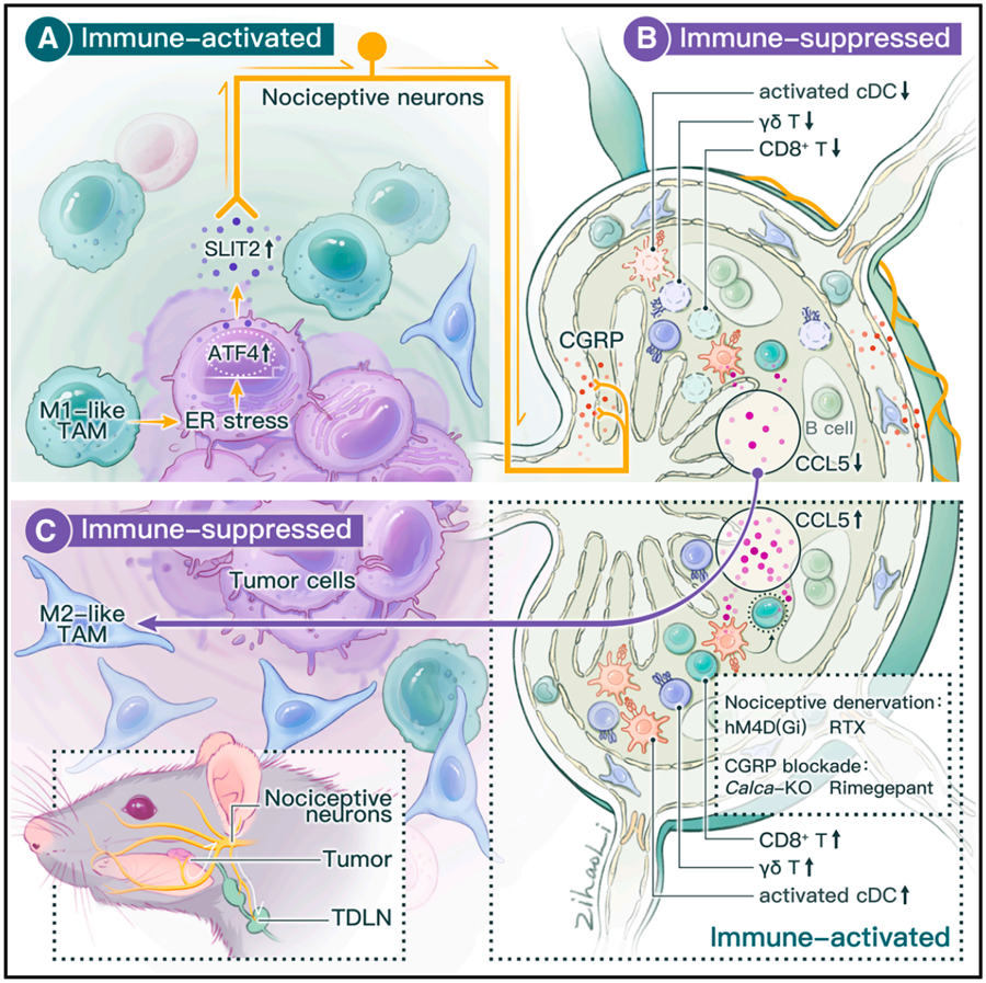 10月24日,中山医院樊嘉院士、季彤教授、周俭教授及孙云帆教授团队联合上海交通大学张陈平教授,在国际顶级期刊《细胞》(Cell)在线发表研究成果,研究首次揭示免疫压力下的肿瘤细胞,可“劫持”感觉神经远程抑制引流淋巴结(TDLN)中的系统性抗肿瘤免疫应答,从而实现免疫逃逸。阻断这种神经介导的肿瘤-TDLN通讯不仅显著增强免疫治疗疗效,也能显著抑制癌痛。研究不仅为理解神经调控肿瘤演进的作用提供了宏环境尺度的新视角,也为开发兼具抑瘤与镇痛作用的治疗新策略提供了理论依据与实验支持。