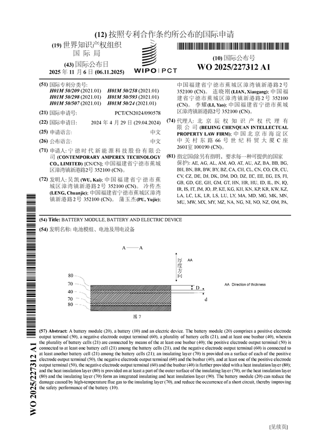 证券之星消息,根据企查查数据显示宁德时代(300750)公布了一项国际专利申请,专利名为“电池模组、电池及用电设备”,专利申请号为PCT/CN2024/090578,国际公布日为2025年11月6日。